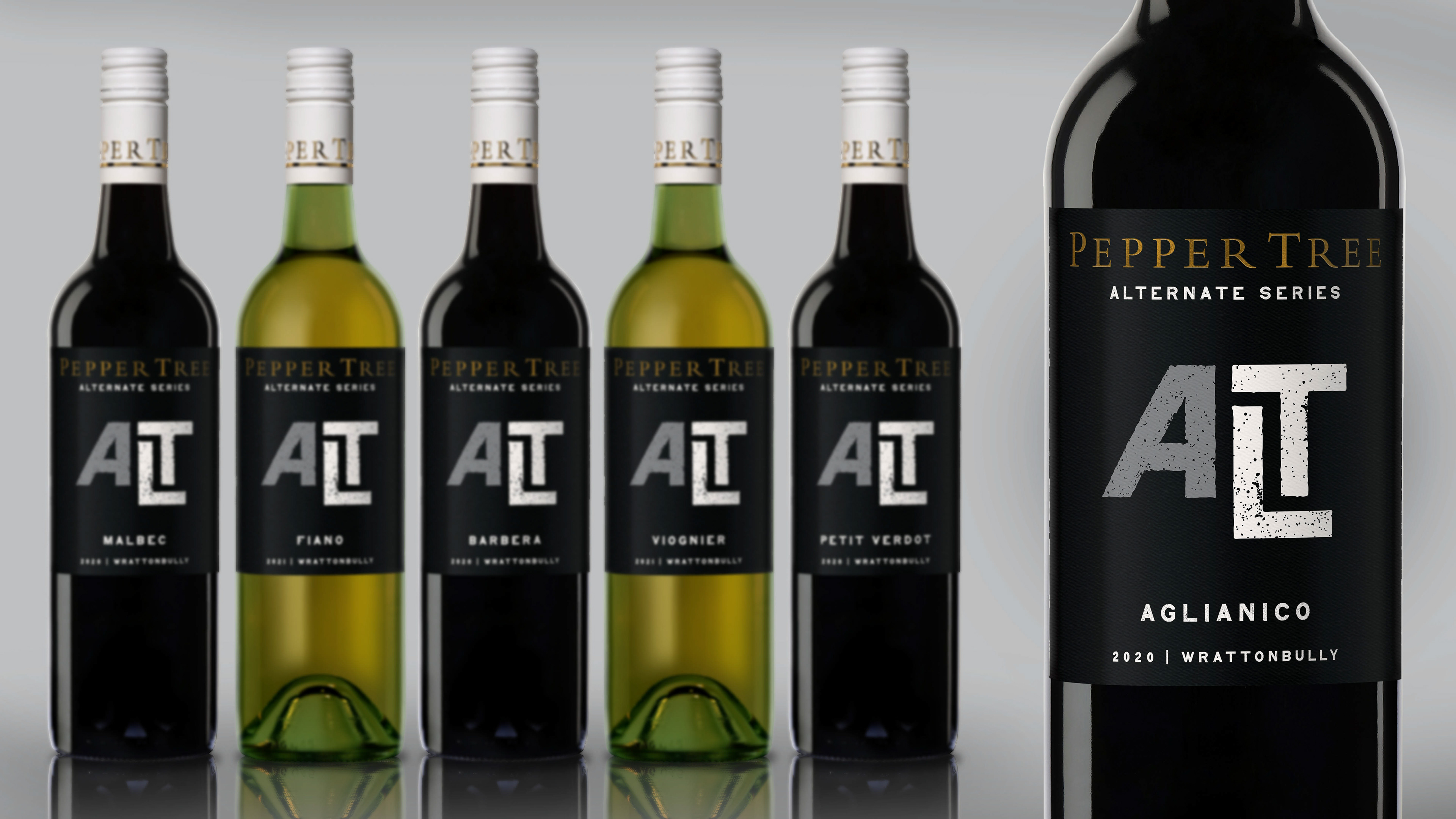 With inaugural releases of Malbec and Barbera on the horizon, Pepper Tree opted to create a dedicated new range to showcase their 'alternate' offerings: lesser-known international varietals packed full of flavour, which have proven to be very suited to the Australian growing conditions and climates. The brief called for a bold, modern design, with a shift to black to differentiate from their standard ranges. The first release of the series includes 6 x varietals originating from Italy & France.